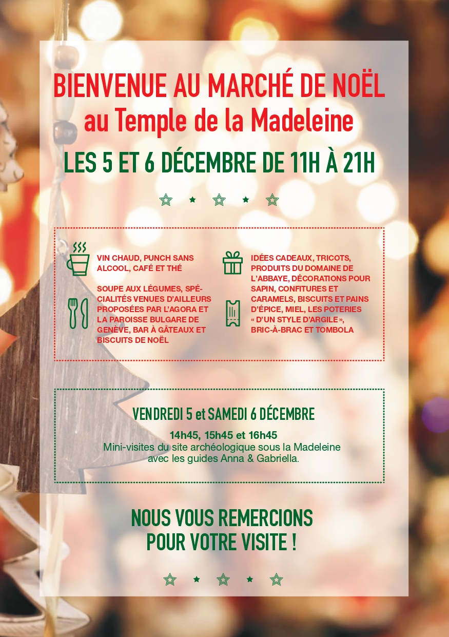 Cadeaux, crèche, douceurs, soupe, bric-à-brac, visites archéologiques et animations musicales.Les bénéfices soutiendront AGIS, Association Genevoise d'Intégration Sociale.